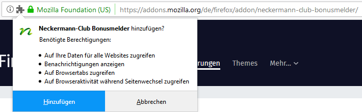 Klicken Sie auf den blauen Button "zu Firefox hinzufügen" um den Bonusmelder zu installieren.